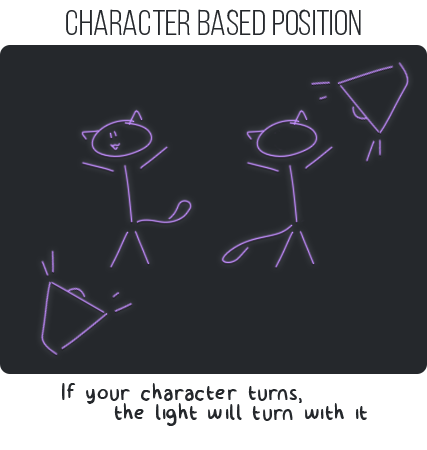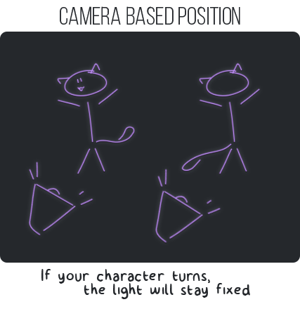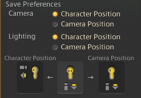 Camera Position, on the other hand, locks the lights relative to your saved camera view. The lights stay fixed based on the camera, not your character’s facing direction.