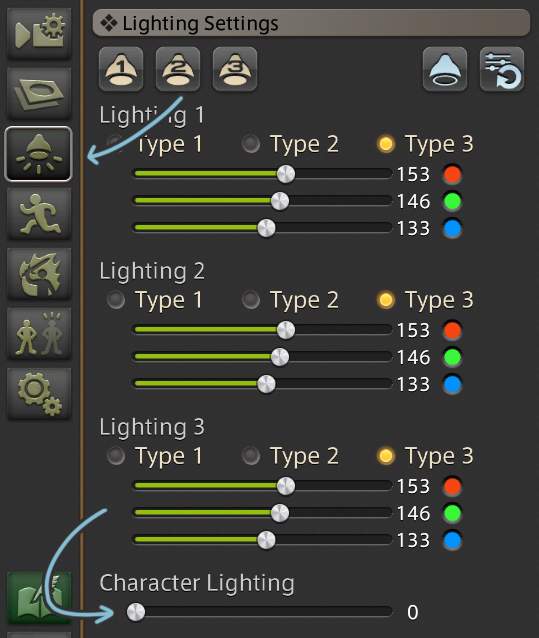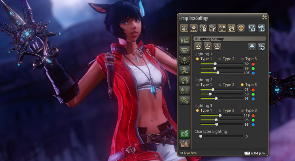 In the Lighting Settings tab you’ll find three free-to-place lights. Unlike the more limited settings we’ve covered so far, these lights can be placed almost anywhere around your character, with only your camera’s reach setting the boundary.