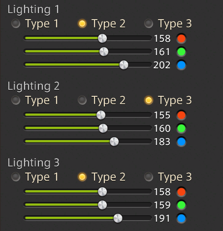 I only set one of the side lights to type 3, as this creates more dynamic shadows than setting all of them to type 3. This is, of course, a matter of personal preference.
